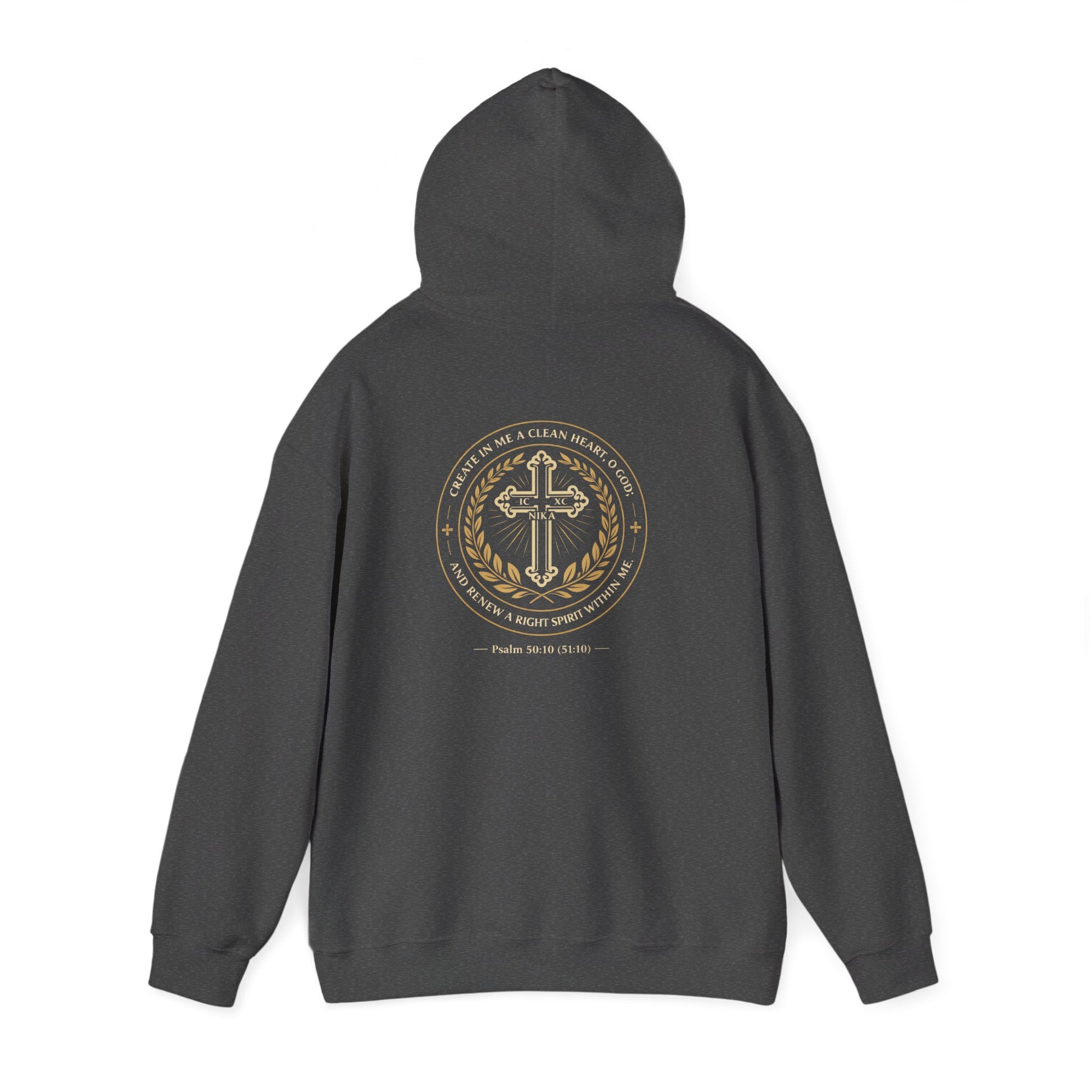 This warm, midweight hoodie carries a quiet, reverent energy — gold emblem work on deep black fabric that reads like a modern emblem of faith. The front shows a heraldic eagle-and-shield motif in metallic tones; the back features a laurel-ringed cross badge with subtle scripture text beneath. It sits comfortably over layers, the double-lined hood and color-matched drawcord adding structure, while the roomy kangaroo pocket keeps hands warm on cool mornings. Wear it to small group gatherings, evening walks, or when you want clothing that reflects your beliefs without shouting. The design balances respect and contemporary streetwear, making it easy to reach for after services, on retreat, or while meeting friends for coffee.