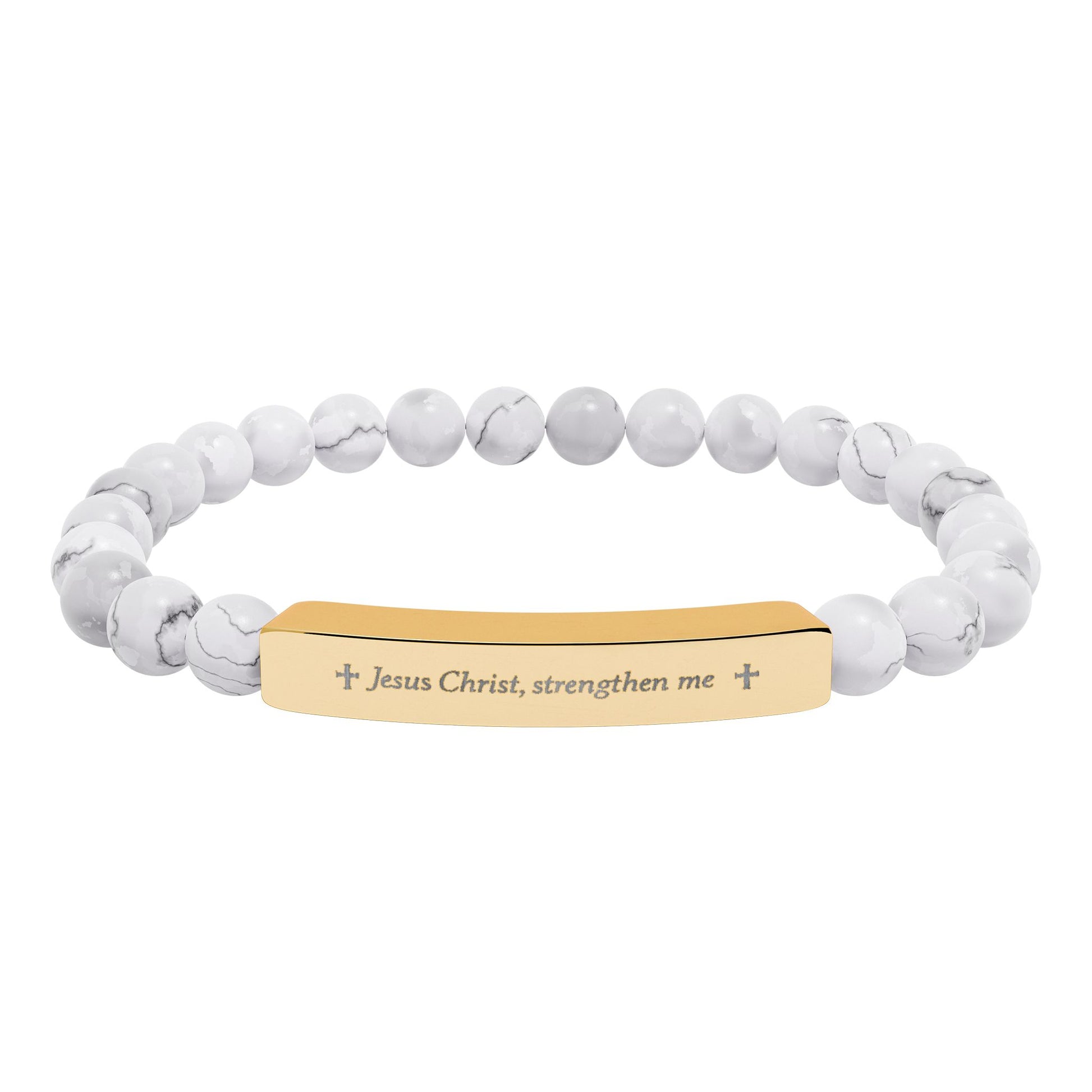 This stretch bead bracelet blends natural stone beads with a sleek engraved stainless steel bar for a calm, refined look. Smooth, muted stones carry soft tones that feel grounded and easy to wear every day. The engraved bar adds subtle meaning without shouting—its permanent etching keeps the message crisp over time. Lightweight and durable, the bracelet slips on easily and sits comfortably against the wrist. It arrives in a white gloss jewelry box with non-tarnish cotton, ready to be worn, kept, or given as a thoughtful, personal token.